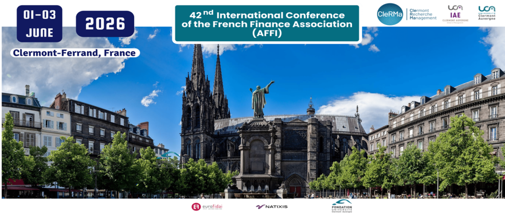 The 42nd International Conference of the French Finance Association (AFFI) will be held at Clermont-Ferrand on June, 1-3, 2026. The conference will be organized by CleRMa (Clermont Recherche Management) and IAE Clermont Auvergne School of Management (University Clermont Auvergne).